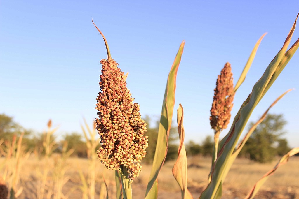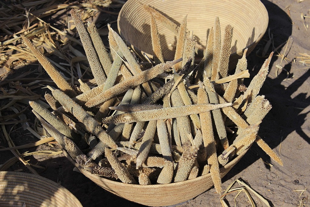 Sorghum: Eine Art Hirse. Man hält es über das Feuer, dann kann man die Kerne rauspulen. Schmeckt etwas nach Popcorn.