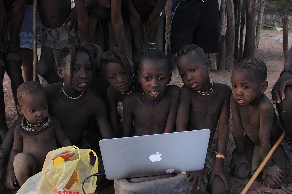 Pedro hat eine Dokumentation über die Himba in diesem Dorf gedreht. Wir fahren vorbei und zeigen ihnen den Film.