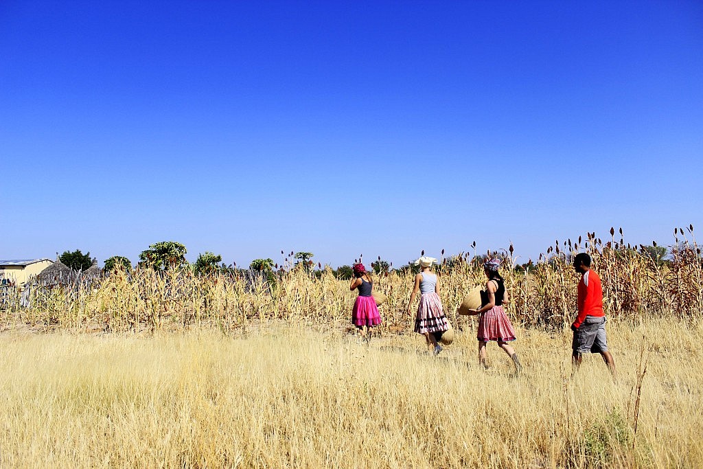 Am ersten Morgen werden wir eingekleidet: Kopftuch und Rock und Ketten. Wir ernten Hirse und werden als vollwertige „White Wambos“ akzeptiert. 😀