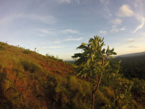 Gegen halb sechs erreichten wir schließlich den Wald. Benjamin erzählte uns, dass der Wald noch schläft, aber bald erwachen wird. Tatsächlich hӧrte man lediglich ein paar Grillen am Wegesrand. Wir liefen auf der breiten Straße immer tiefer in den Wald hinein, als Benjamin plӧtzlich anhielt. Er hatte einen bestimmten Vogel (die genaue Bezeichnung habe ich wieder vergessen) gehӧrt, der jeden Morgen gegen sechs Uhr einen typischen Ruf von sich gibt, vergleichbar mit unserem Hahn. Wie auf ein Zeichen, hӧrten wir danach immer mehr Vӧgel und Frӧsche (Benjamin kannte sie alle und konnte sie auch immitieren). Besonders beeindruckend waren kurze Zeit später die Laute der Affen, die in Kämpfen ihr Revier verteidigten. Immer wieder warfen wir besorgte Blicke gen Osten, wo sich der Himmel bereits leicht rӧtlich färbte. Schließlich wollten wir den Sonnenaufgang auf einem Hügel oberhalb des Waldes sehen und hatten noch keine Hӧhenmeter zurückgelegt. Doch dann Benjamin bog mit dem Satz „Don`t worry, we are still in time.“ rechts in einen schmaleren Weg ein, wo es nun auch endlich bergauf ging. Und dann, nach wenigen Minuten, erreichten wir den Hügel. Die Aussicht war einfach atemberaubend! Wir konnten den ganzen Wald von oben überblicken und die Sonne langsam aufgehen sehen. Über den Flüssen, die sich ihren Weg durch den Regenwald bahnten, sammelte sich der Nebel. Eine tolle Atmosphäre für ein kleines Picknick. Während wir uns unsere Erdnussbuttertoasts schmecken ließen und eine Menge Fotos machten, wurde es immer heller und die Fülle an Grüntӧnen immer beeindruckender.