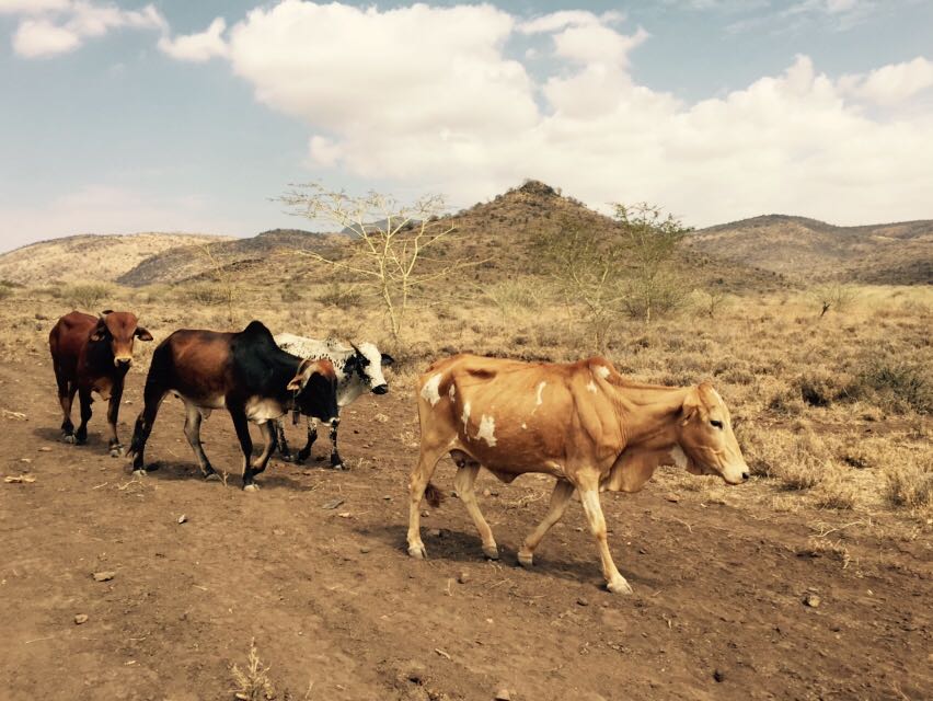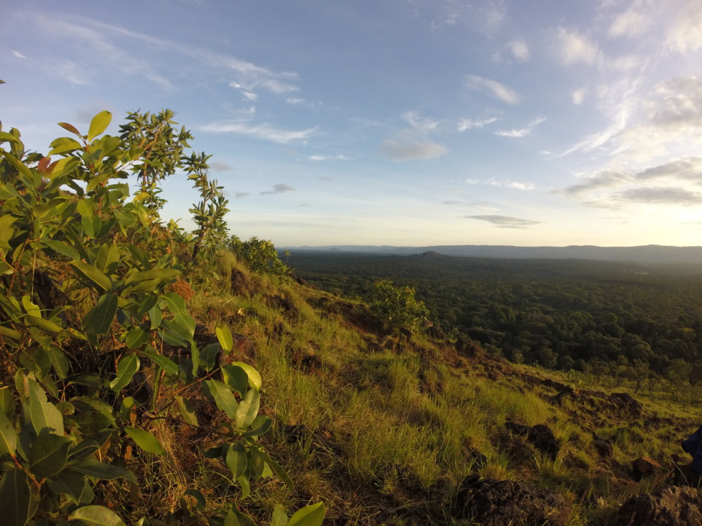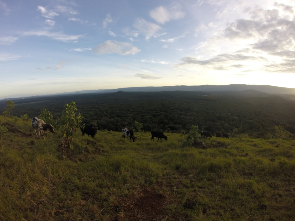 Später gingen wir noch zur anderen Seite des Hügels, wo wir in der Ferne auch eine große Waldlichtung ausmachen konnten. Auf dem Weg begegnete uns eine Kuhherde. Diese hätte ich in einem Regenwald nun wirklich nicht vermutet, zumal wir ihre Hinterlassenschaften grӧßeren Affen zugeordet hatten. So kann man sich täuschen! 😀