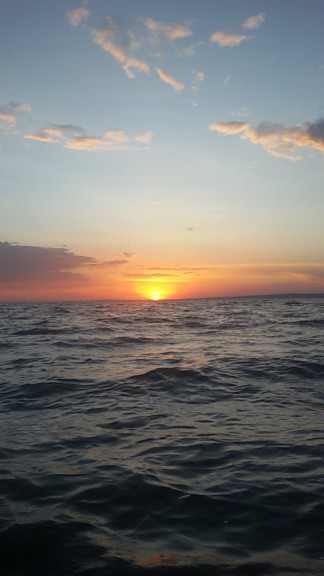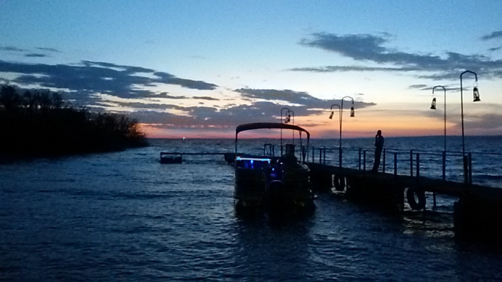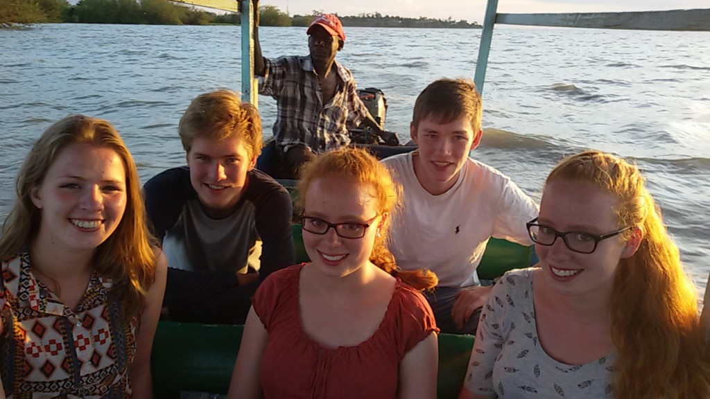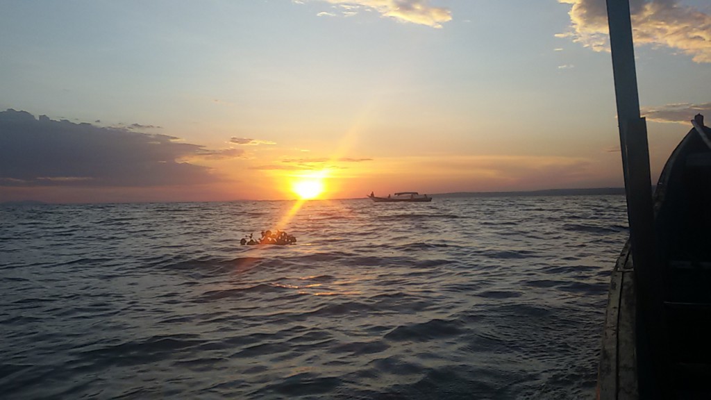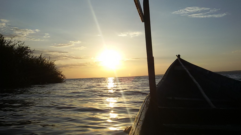 Dort angekommen, setzte sich die Hälfte von uns in ein Restaurant, während Sina, Cathrin, Simon, Florian und ich den Sonnenuntergang vom Boot aus sehen wollten. Mit Vincent, unserem Guide, und dem Steuermann George fuhren wir also auf den Viktoriasee hinaus. Vincent erzählte uns von der Wasserhyazinthe, einer Wasserpflanze, die sich auf dem Viktoriasee rasant vermehrt und einige Teile des Sees unbefahrbar macht. Und dann guckten uns auf einmal zwei Augen aus dem Wasser an. Darauf nochmal zwei! Sie gehӧrten zu Flusspferden, die im Viktoriasee leben und nachts im Gras am Ufer übernachten. Wir konnten unseren Augen kaum trauen. George machte den Motor aus und wir trieben eine Weile neben den Flusspferden im Wasser. Da währendessen in unserem Rücken die Sonne unterging, wussten wir gar nicht, wo wir hingucken sollten. Es war wunderschӧn! George lenkte das Boot so, dass wir alle einen guten Blick auf die schnell untergehende Sonne hatten, die sich im Wasser spiegelte. Einfach traumhaft!
