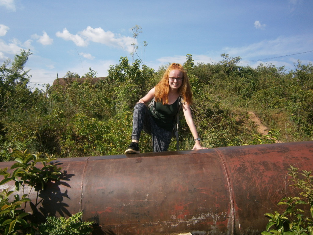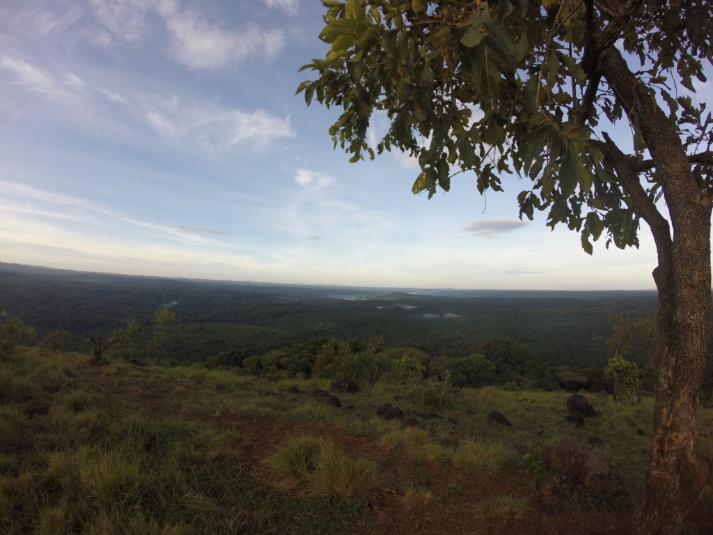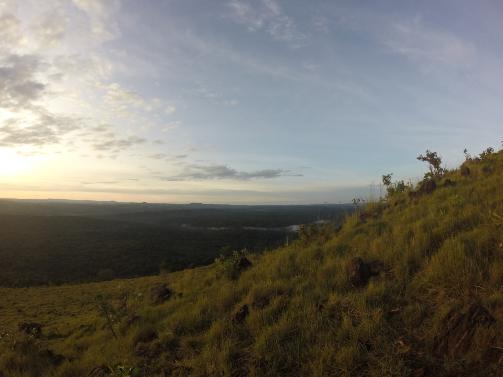 Gegen halb sechs erreichten wir schließlich den Wald. Benjamin erzählte uns, dass der Wald noch schläft, aber bald erwachen wird. Tatsächlich hӧrte man lediglich ein paar Grillen am Wegesrand. Wir liefen auf der breiten Straße immer tiefer in den Wald hinein, als Benjamin plӧtzlich anhielt. Er hatte einen bestimmten Vogel (die genaue Bezeichnung habe ich wieder vergessen) gehӧrt, der jeden Morgen gegen sechs Uhr einen typischen Ruf von sich gibt, vergleichbar mit unserem Hahn. Wie auf ein Zeichen, hӧrten wir danach immer mehr Vӧgel und Frӧsche (Benjamin kannte sie alle und konnte sie auch immitieren). Besonders beeindruckend waren kurze Zeit später die Laute der Affen, die in Kämpfen ihr Revier verteidigten. Immer wieder warfen wir besorgte Blicke gen Osten, wo sich der Himmel bereits leicht rӧtlich färbte. Schließlich wollten wir den Sonnenaufgang auf einem Hügel oberhalb des Waldes sehen und hatten noch keine Hӧhenmeter zurückgelegt. Doch dann Benjamin bog mit dem Satz „Don`t worry, we are still in time.“ rechts in einen schmaleren Weg ein, wo es nun auch endlich bergauf ging. Und dann, nach wenigen Minuten, erreichten wir den Hügel. Die Aussicht war einfach atemberaubend! Wir konnten den ganzen Wald von oben überblicken und die Sonne langsam aufgehen sehen. Über den Flüssen, die sich ihren Weg durch den Regenwald bahnten, sammelte sich der Nebel. Eine tolle Atmosphäre für ein kleines Picknick. Während wir uns unsere Erdnussbuttertoasts schmecken ließen und eine Menge Fotos machten, wurde es immer heller und die Fülle an Grüntӧnen immer beeindruckender.