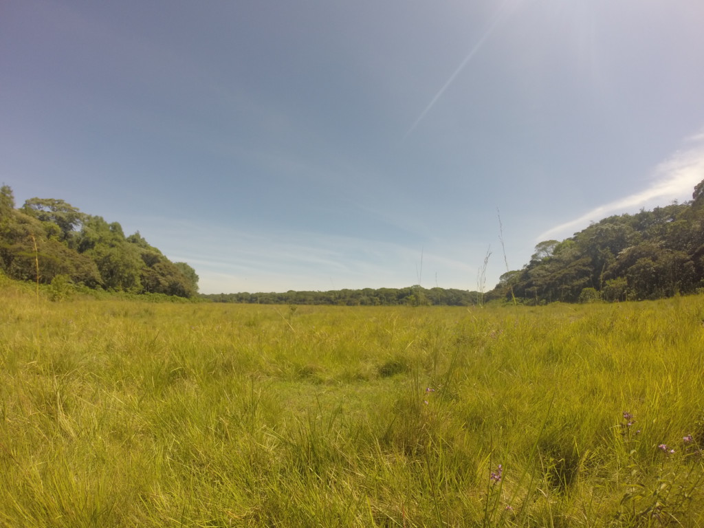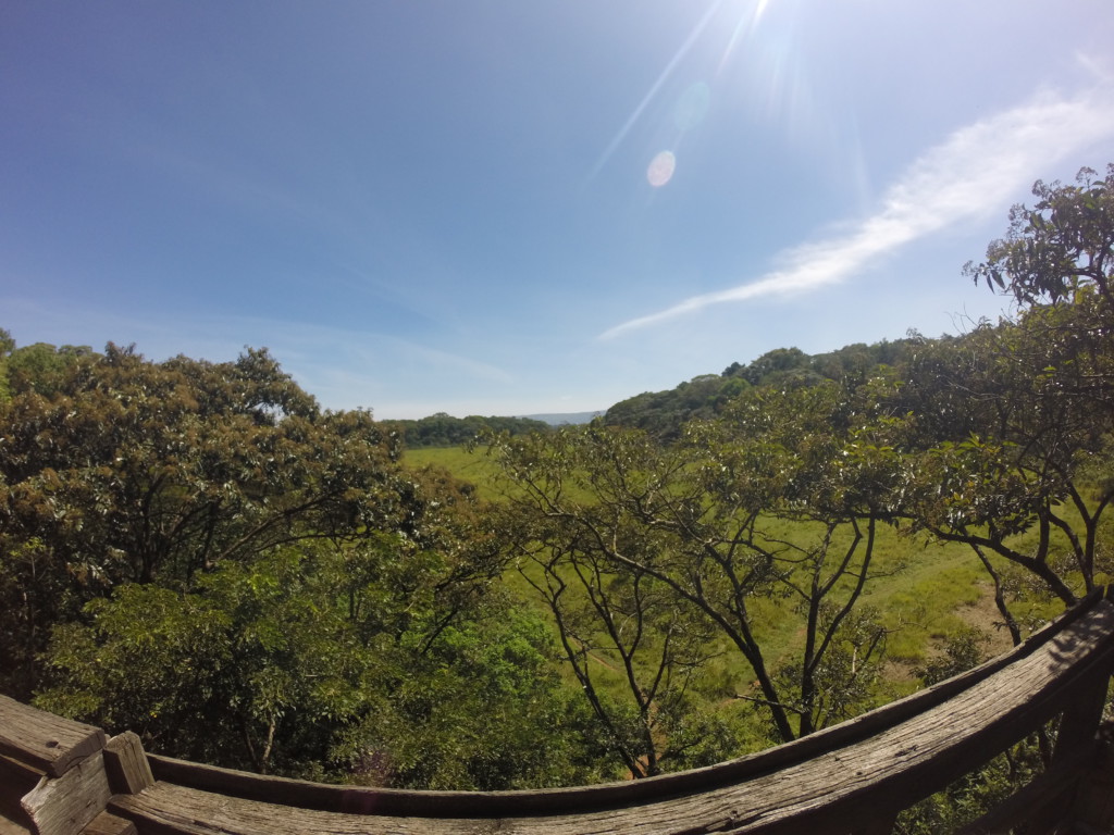 Vor der Hӧhle machten wir noch schnell ein Gruppenfoto, bevor wir uns dann wieder auf den Abstieg begaben. Und nun begann der wirkliche Weg durch den Regenwald. Auf kleinen und zum Teil leicht zugewachsenen Pfaden folgten wir Benjamin durch den Wald und erfuhren eine Menge über die verschiedenen Baum-, Tier-, und Pflanzenarten und ihren Nutzen für den Menschen (fast jede Pflanze war gut für oder gegen irgendwas, sodass wir uns zeitweise wie in einer riesigen Freiluftapotheke vorkamen). 😀 Und dann erreichten wir die Lichtung, die wir zuvor vom Hügel aus gesehen hatten. Es gab einige Blumen und hochgewachsenes Gras. Wir kletterten auf einen Aussichtsturm, von wo wir einen guten Blick über die Lichtung, aber auch auf die Affen in den Bäumen hatten.