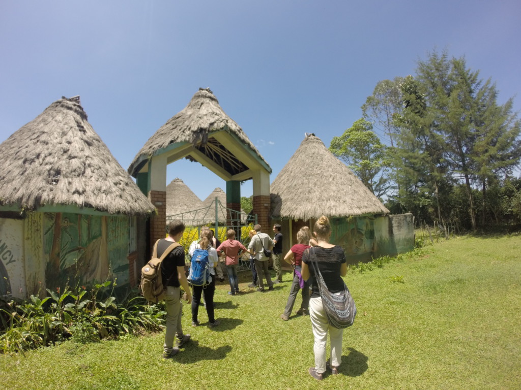 Danach ließen wir den Wald hinter uns und durchquerten eine Teeplantage. Dort trafen wir eine Gruppe von Menschen, die singend und tanzend in einer Art Prozession liefen, sowie einige Soldaten. Kurze Zeit später erreichten wir eine Reptilienfarm. Dort durften wir Chamäleons auf die Hand nehmen und sahen Wasserschildkrӧten und Krokodile. Das Schlangengehege war noch leer. Dort endete unsere Tour. Wir trugen uns in Benjamins Visitorsbook ein und bedankten uns herzlich für die interessante Tour und die vielen Informationen, die er uns gegeben hat. Danach ging es in einer Bodaboda Karawane zurück nach Kakamega Town. Ein gelungener Ausflug!