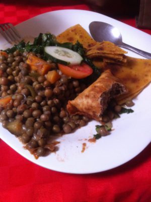 Nach etwa zehn Minuten war das Spektakel dann vorbei und wir fuhren zurück zum Ufer, wo wir den anderen von unseren Beobachtungen berichteten. Dort trafen wir dann noch vier andere Freiwillige aus Kisumu, unterhielten uns kurz mit ihnen und verabredeten uns für später. Dann ging es mit dem Bodaboda zurück in die Stadt, wo wir im „Green Garden“ Restaurant zu Abend aßen. Auch das war ein voller Erfolg! Auch wenn auf der Speisekarte auch eine Menge internationaler Gerichte wie Pizza, Nudeln und sogar Cordon Bleu zu finden waren, entschied ich mich für ein kenianisches Bohnengericht (Dengu) mit Samosas (mit Beef gefüllte Teigtaschen) und Chapati. Es war sehr lecker und gemütlich! Den Abend verbrachten wir zunächst auf der Dachterasse des Hotels, bis ich anschließend mit ein paar anderen noch einmal loszog, um das Nachtleben in Kisumu kennen zu lernen.