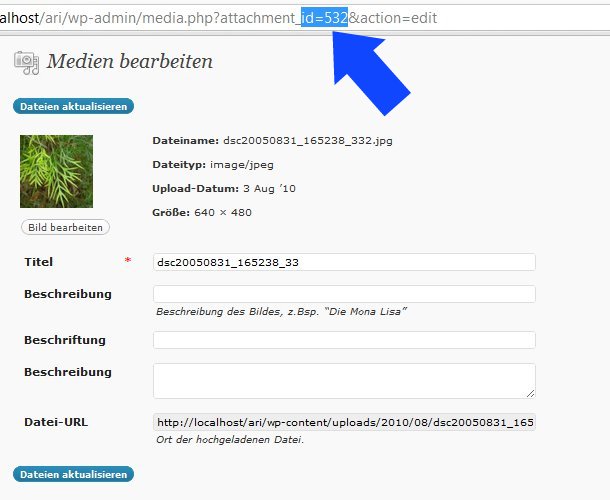 Die ID eines Bildes kannst du herausfinden, indem du es in Mediathek / Medienübersicht anklickst. Die ID ist dann über die URL in der Addressleiste deines Browsers sichtbar.