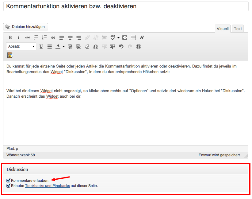 Du kannst für jede einzelne Seite oder jeden Artikel die Kommentarfunktion aktivieren oder deaktivieren. Dazu findet du jeweils im Bearbeitungsmodus das Widget „Diskussion“, in dem du das entsprechende Häkchen setzt: