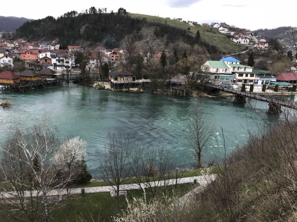 Heute (13.03.) hat mich dann meine Ansprechperson etwas in der Stadt herumgeführt. Ich hoffe mal, dass ich mich schnell zurechtfinden werde, auf jeden Fall wohne ich direkt im Zentrum und komme überall zu Fuß hin. Ich finde die Stadt wirklich schön. Besonders die Una ist natürlich ein Traum, weil der Fluss mitten durch die Stadt fließt. Momentan ist allerdings das Wasser sehr hoch, weil noch vor zwei Wochen viel Schnee gefallen ist und der Schnee dann geschmolzen ist. Aber ich will nicht verschweigen, dass man noch Kriegsspuren vom Krieg vor 20 Jahren sieht. Bosnien wurde während des Bosnienkrieges besonders schwer getroffen, viel musste wiederaufgebaut werden. Naja und dann wurde halt nicht immer alles wiederaufgebaut. Manche Häuser haben also Einschusslöcher oder sind nur noch Ruinen, mein Balkonsichtschutz hat auch ein Loch. Meine Ansprechpartnerin sagte, dass es den Bosniern natürlich nicht mehr auffallen würde,  sie seien es ja gewohnt. Ich wusste das auch schon vorher und war dementsprechend nicht schockiert. Aber diese Häuser sind nicht (!) in der Mehrzahl, ansonsten ist Bosanska Krupa so wie jede andere Stadt auch. Es gibt schöne Ecken, weniger schöne Ecken, belebte Ecken und weniger belebte Ecken. Schöner war das ganze natürlich dadurch, dass die Sonne schien und es nicht wirklich kalt war.