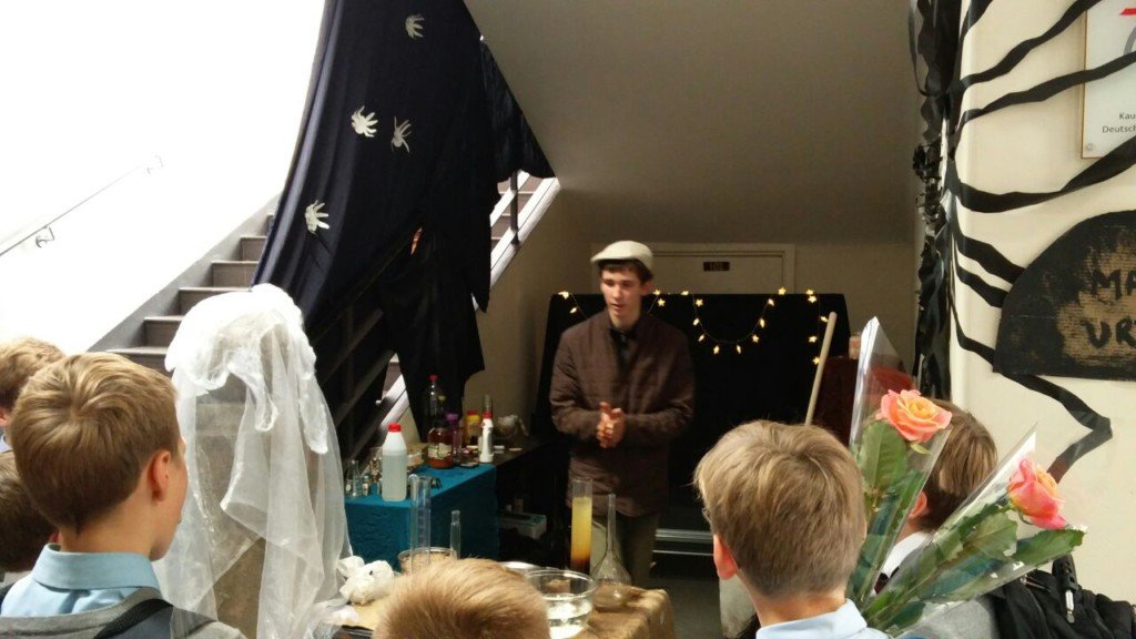 Um kurz nach elf wurden dann alle aus der Lobby gebeten, weil die Zwölftklässler Generalprobe hatten. Dann gingen alle Lehrer gemeinsam nach unten, gespannt und mit einem Lächeln im Gesicht. Die Schüler hatten einen breiten Gang hin zur Bühne gebildet. Neben der Bühne stand ein Klavier. Zum Hochzeitsmarsch schritten Braut und Bräutigam die Bühne empor, wo sie feierlich getraut wurden, indem ihre Hände mit einem roten Band zusammengebunden wurden. Dann strömte der Rest der Zwölftklässler auf die Bühne und sie fingen gemeinsam an „Hakuna Matata“ auf Litauisch zu singen, gefolgt von „Can you feel the love tonight“.