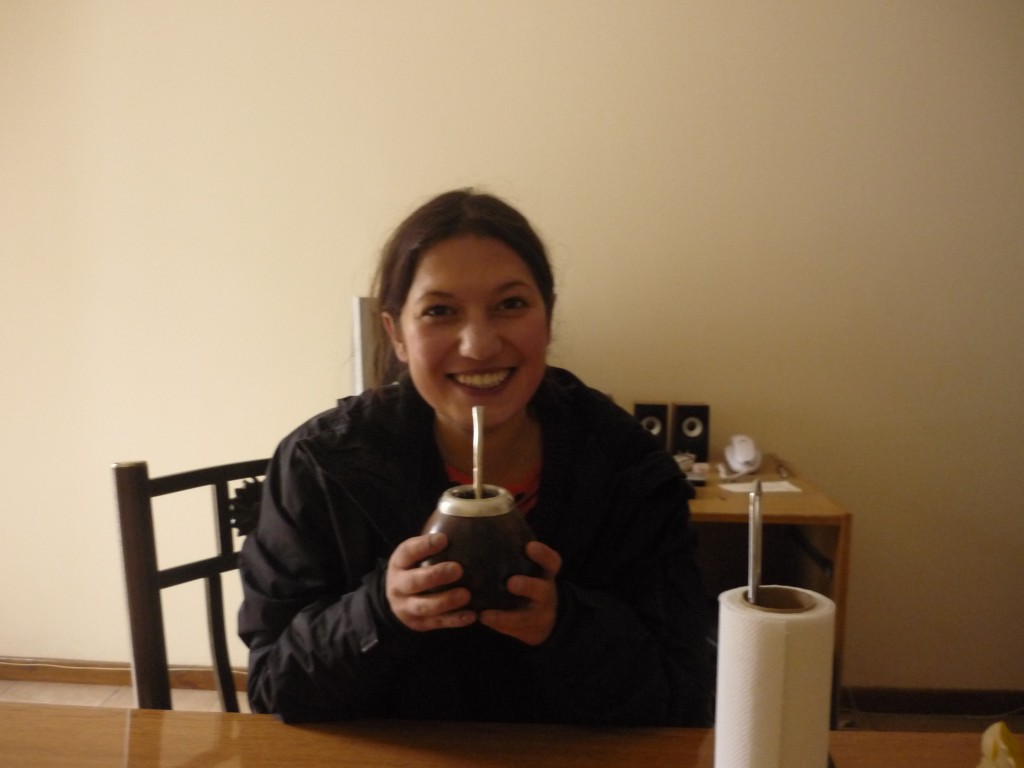 Ich bin jetzt 9 Tage hier und habe zwei Asados gegessen und zwei Mal Mate getrunken. Da ich sowieso gerne grünen Tee mag, hatte ich keine Probleme mich an den Geschmack von Mate zu gewöhnen. (Ist überhaupt nicht so wie „Clubmate“ ) In einem kleinen Holzgefäß wird Matetee mit heißem Wasser aufgegossen. Dafür gibt’s dann die Thermoskanne, mit welcher man die Mate immer wieder aufgießt. Man trinkt das dann aus einer Bombilla (Metallröhrchen ) entweder mit oder ohne Zucker. Wenn man das in einer Gruppe trinkt, wird der Behälter rumgegeben, wie eine Friedenspfeife.