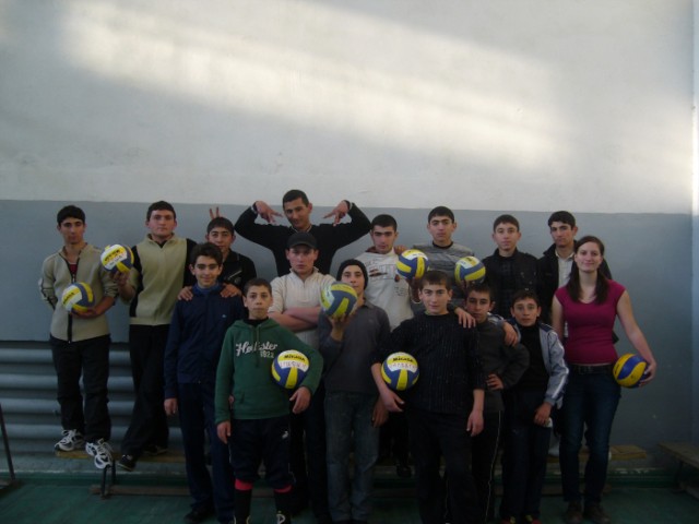 Endlich ist sie da: Meine eigene, ganz persönliche Volleyball – AG, trotz Startschwierigkeiten (keine Bälle vorhanden). Dieses Problem konnte ich mithilfe von Sponsoren – hier noch mal herzlichen Dank an die Musikabteilung des Ortenburg – Gymnasiums Oberviechtach und ganz besonders an Herrn Bock und Christoph Fonk – lösen. Und jetzt kann ich drei total unterschiedliche, aber auch sehr liebenswerte Mannschaften vorweisen. Die Bälle musste ich in Deutschland kaufen, da es in Armenien keine Mikasa- oder Molten – Volleybälle gibt, bestenfalls ganz schlechte Fälschungen, mit denen man nicht normal spielen kann. Auch kein vergleichbarer Ersatz war in den wenigen Sportgeschäften in Eriwan zu finden… Aber jetzt sind sie ja da. Und inzwischen schon ganz grau vom Dreck (Staub lässt sich das, was sich im Turnhallenboden festgesetzt hat, schon nicht mehr nennen, obwohl regelmäßig gewischt wird) und ein bisschen grün, dort wo die grün angemalten Bretter, durchschimmern. Aber im Gegensatz zu den anderen Schulen HABEN wir zumindest eine Turnhalle, die benutzbar ist. Und inzwischen finde ich sie echt super: Das Netz ist zweckmäßig und Linien sind vorhanden.