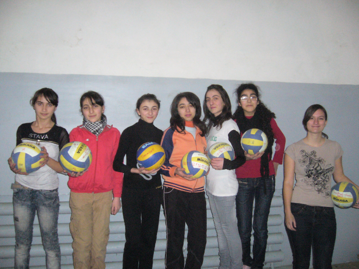 Endlich ist sie da: Meine eigene, ganz persönliche Volleyball – AG, trotz Startschwierigkeiten (keine Bälle vorhanden). Dieses Problem konnte ich mithilfe von Sponsoren – hier noch mal herzlichen Dank an die Musikabteilung des Ortenburg – Gymnasiums Oberviechtach und ganz besonders an Herrn Bock und Christoph Fonk – lösen. Und jetzt kann ich drei total unterschiedliche, aber auch sehr liebenswerte Mannschaften vorweisen. Die Bälle musste ich in Deutschland kaufen, da es in Armenien keine Mikasa- oder Molten – Volleybälle gibt, bestenfalls ganz schlechte Fälschungen, mit denen man nicht normal spielen kann. Auch kein vergleichbarer Ersatz war in den wenigen Sportgeschäften in Eriwan zu finden… Aber jetzt sind sie ja da. Und inzwischen schon ganz grau vom Dreck (Staub lässt sich das, was sich im Turnhallenboden festgesetzt hat, schon nicht mehr nennen, obwohl regelmäßig gewischt wird) und ein bisschen grün, dort wo die grün angemalten Bretter, durchschimmern. Aber im Gegensatz zu den anderen Schulen HABEN wir zumindest eine Turnhalle, die benutzbar ist. Und inzwischen finde ich sie echt super: Das Netz ist zweckmäßig und Linien sind vorhanden.