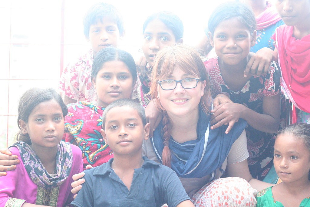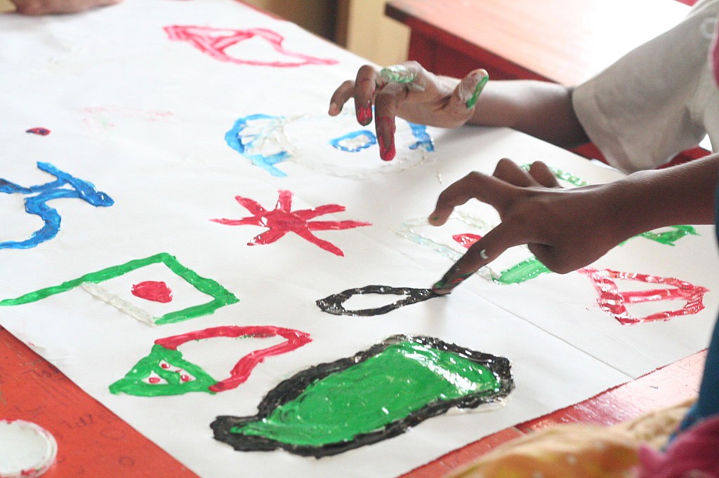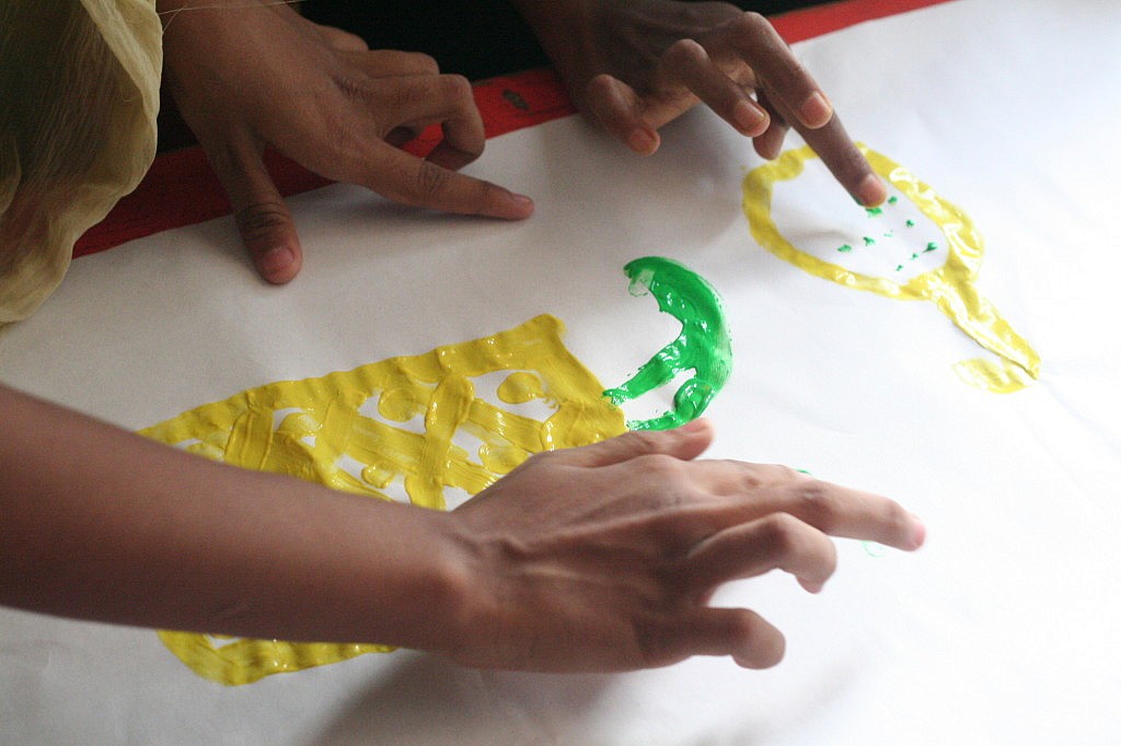 60 Kinder und ich malen unser Lieblingsessen mit Fingermalfarben auf großes Papier. Die Kinder sind Schüler der Shishu Neer Schule. Diese Malerei ist ein kleiner Teil meines Kulturweit-Projektes „Flour Power“ – mehr dazu später. Ich möchte an dieser Stelle nicht unerwähnt lassen, dass unsere Kommunikation auf Bangla stattfand und wir einander verstanden haben. (Mit gelegentlicher Anwendung von Kommunikationshilfen wie Hände und Füße.) Ich glaube ich bin vor Stolz zwei Zentimeterchen gewachsen.
