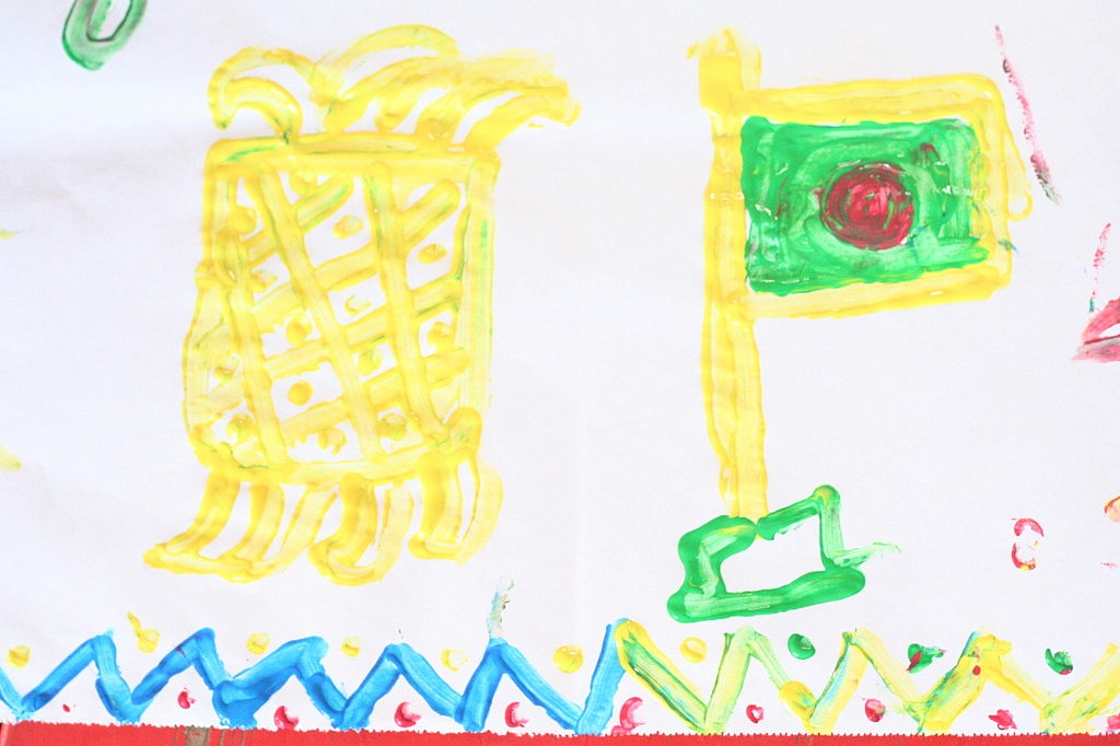 Tomar ki ki khaba bhalo lage? On the pictures you can see painted mangos, pineapples, ice-cream, lollipops and cakes. Some fish are there and one egg. Several Bangladesh flags, cricket bats and balls, two fishing boats and a village. These you can’t eat, but that doesn’t really matter.