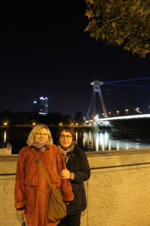 (Gabi und Astrid an der Donau mit Blick auf die Ufo Brücke, welche die neueste und  bekannteste Donau Brücke ist in Bratislava.)