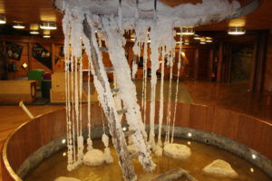Letzte Woche war ich nochmal mit Michaela unterwegs gewesen. Wir sind zu einer Therme gefahren um in einem speziellen Becken zu baden, welches nur im Winter auf hat. Es war -4 Grad und das Becken war draußen. Es ist gefüllt mit über 40 Grad heißem thermal Wasser aus Heilquellen in der Nähe. Das Wasser war gelb/grünlich gefärbt und voll von Mineralien die sich auf der Haut ablagerten. Nach dem ich mich an die Kälte an meinem Kopf und die Hitze am Rest meines Körpers gewöhnt hatte, war es sehr angenehm und entspannend, besonders nachdem ich eine kleine Abkühlung im Kaltwasserbecken genommen hatte. Da es bei der Hitze besonders wichtig ist viel zu trinken, hatte jeder Badegast seine Wasserflasche mit ins Becken genommen.