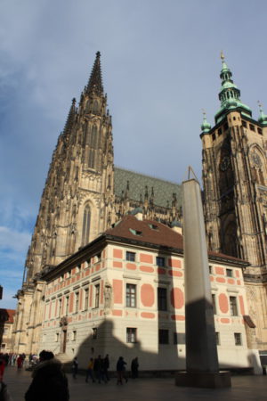Die Prager Burg bildet das größte geschlossene Burgareal der Welt und liegt auf dem Berg Hradschin. Heute ist sie die Residenz des Präsidenten der Tschechischen Republik. Wir waren am 17. November dort, dem Nationalfeiertag des Kampfes für Freiheit und Demokratie in Tschechien und auch in der Slowakei. Im Jahr 1939 fanden an diesem Tag Studentenproteste  gegen die deutsche Besetzung der Tschechoslowakei statt. Auch ist der 50. Jahrestag im Jahr 1989, der Auslöser der samtenen Revolution. Samtene Revolution bezeichnet den politischen Systemwechsel der Tschechoslowakei vom Realsozialismus zur Demokratie im November und Dezember 1989. Der Begriff wurde gewählt, weil der Wechsel, der sich innerhalb weniger Wochen vollzog, weitgehend gewaltfrei erfolgte.