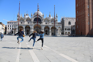 12:09 Ich war noch nie in Venedig, gehe aber stark davon aus, dass die Stadt ohne Lockdown nicht so menschenleer wie jetzt ist, das Wasser in den Kanälen nicht so klar und die Läden und Restaurants nicht verrammelt. Ich komme mir vor wie in einer Geisterstadt. Am leeren Markusplatz wollen wir ein Sprungfoto machen und springen wieder und wieder, bis es synchron wird. Dann kommt die Polizei auf uns zu, denn eigentlich ist Venedig rote Zone und man darf das Haus nur mit gutem Grund verlassen. Anscheinend wird auf dem Markusplatz rumhüpfen nicht als guter Grund anerkannt, also springen wir lieber mal weg.
