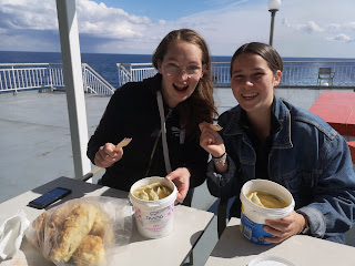 01:37 Wir essen Brownies und Zitronenkuchen in unserer Kabine mit Meerblick. Die Müdigkeit habe ich übersprungen und bin bei der Hyperaktivität angelangt. Wir lachen sehr viel, auch und vor allem über Dinge, die für Außenstehende nicht lustig sind.