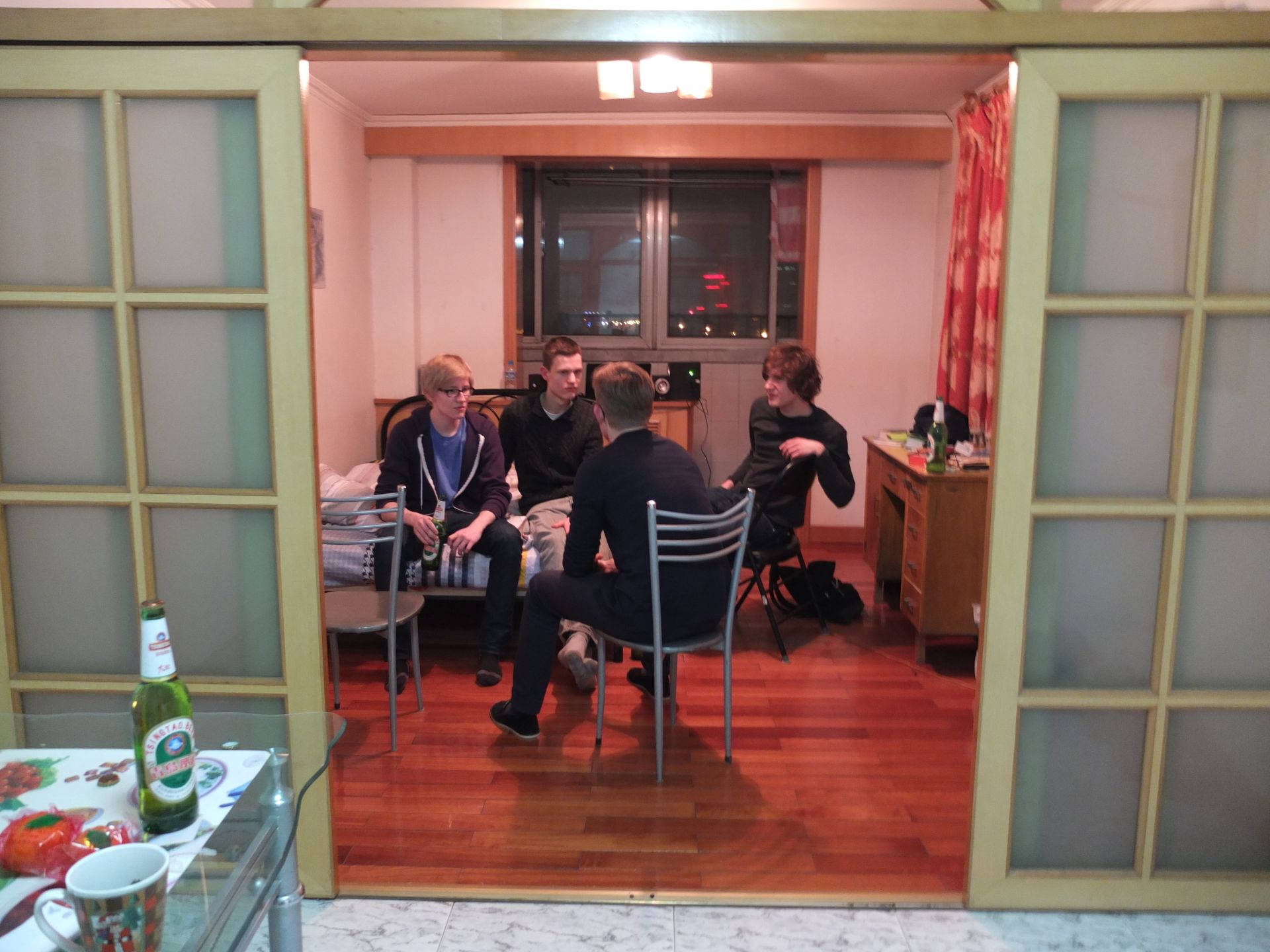 Nachdem wir unsere Tour beendet hatten, fuhren wir zurück zum Hotel, verabschiedeten uns auf dem Weg von Verena und am Hotel dann auch von Frau Hunold. Dort angekommen, rief ich meinen Bruder Felix an, weil ich ihn gerne in seiner beijinger Wohnung besuchen wollte. Nach kurzer Absprache, schickte er mir seine Adresse per SMS, die wir dem Taxifahrer zeigen sollten. Der Plan war folgender: Wir wollten zuerst bei Felix mit seinem Mitbewohner Karl warme Milch mit Honig trinken und danach gemeinsam zu einem Rolf Zukowski Konzert gehen.