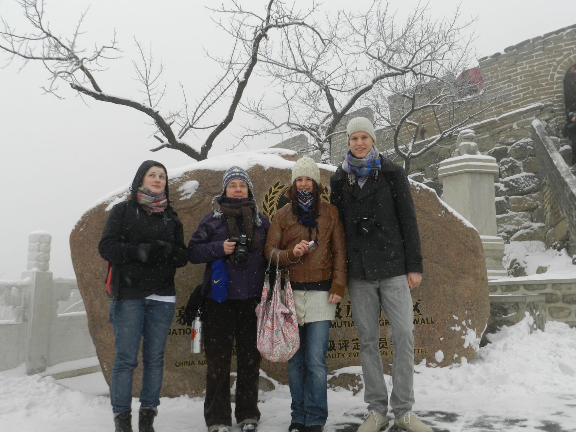 Wir fuhren mit einem sehr netten Fahrer zur Mauer. Auf dem Weg lasen wir noch Verena auf, die am Straßenrand auf uns wartete. Während der Fahrt unterhielten wir uns sehr nett und lustig. Als wir die Stadt verließen, bemerkten wir, dass der vorher eher mickrig wirkende Schneefall die ganze Landschaft bedeckte. Es war sehr schön anzusehen, auch wenn Nebel die Sicht auf die Berge, über die sich die Mauer zieht, stark einschränkte.