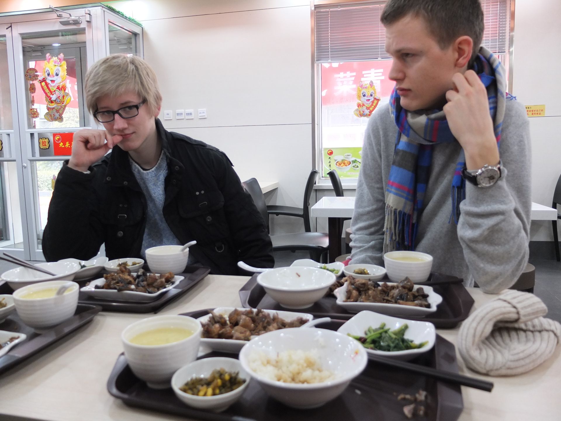 Am nächsten Morgen half ich Fritzi mit ihrer Tasche und verabschiedete mich von ihr und Julian. Dann saß ich noch ungefähr zwei Stunden auf meinem Zimmer und schrieb. Schließlich rief mich mein Bruder an und ich nahm ein Taxi zu ihm. Mit ihm verbrachte ich noch die Zeit bis kurz nach zwei. Wir gingen in die selbe Garküche, wie am Freitag Abend und sprachen mit ein paar hübschen Studentinnen (mein Bruder und Karl nennen sie „Meinüs“. Mei= hübsch, Nü= Frau). Essen haben wir natürlich auch bestellt, allerdings zum Mitnehmen, weil es rappelvoll war. Auf dem Rückweg meinte ich noch: „Wetten Karl wird jetzt wach und will was essen.“ Und so war es dann auch.