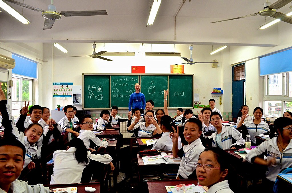 Ihr könnt euch das wahrscheinlich jetzt schwer vorstellen, aber ich unterrichte tatsächlich Deutsch in der achten und neunten Klasse der Wuhan Changqing Nummer 1 Mittelschule. Ich trete also sieben Mal in der Woche vor eine 56-Mann starke Klasse und erkläre Sachen wie Präpositionen, Artikel und anderen üblichen fachspezifischen Kram. Dabei muss ich sehr viel auf das Englische Vokabular zurückgreifen und vor allem sehr langsam sprechen. Vielleicht zahlt es sich auch gerade hier aus, dass ich während der Gymnasialzeit den Unterricht des Darstellenden Spiels besucht habe. Denn im Grunde muss man ein kleiner Schauspieler sein, der keine Scheu davor haben darf, pantomimisch und mit sehr viel Einsatz von Mimik und Gestik den Schülern das nahe zu bringen, was sie am Ende des Tages erlernen sollen. Es kommt vor allem darauf an, dass ich es da vorn schaffe in den Köpfen der Schüler ein Bild zu konstruieren, welches sie mit dem theoretischen Material verknüpfen können, um sich bestimmte deutsche Wörter einzuprägen. So habe ich zum Beispiel bei der Einführung der Präpositionen einen Stuhl verwendet um zum Beispiel „an“, „über“ und „unter“ vorzustellen!