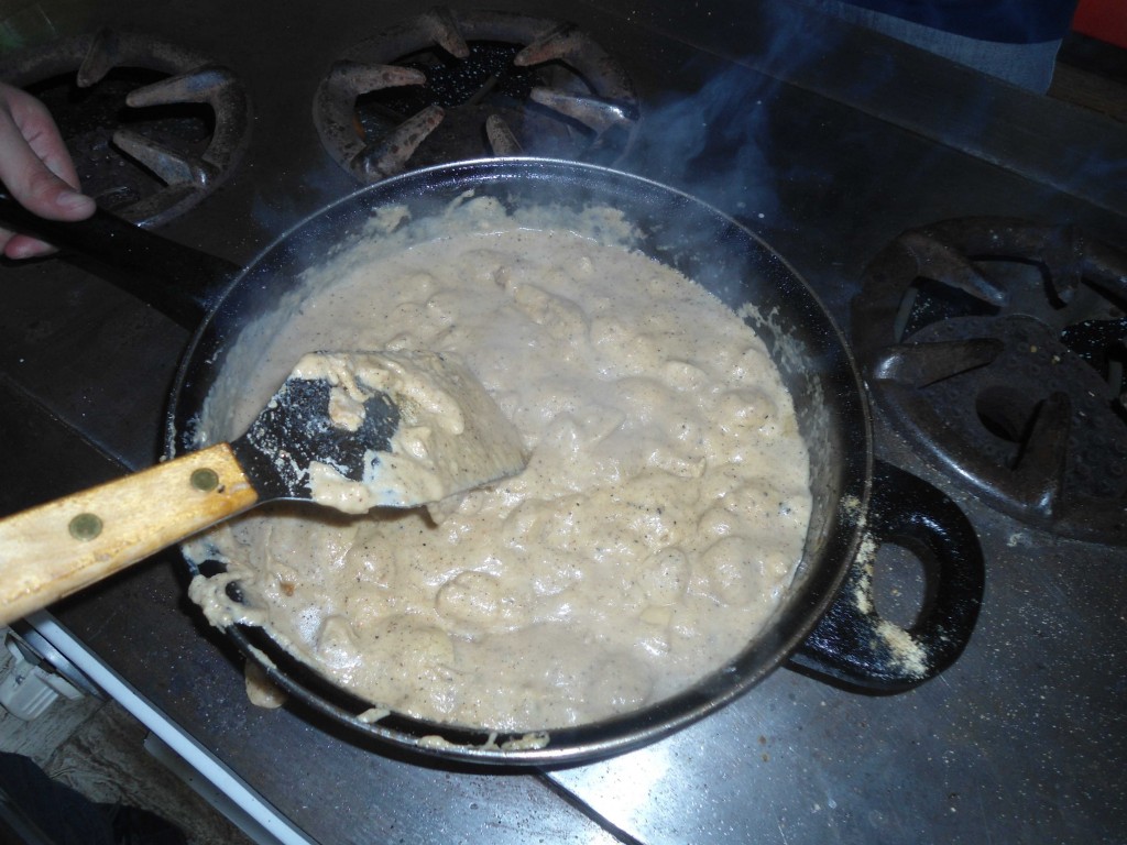 Das war bei uns übrigens nicht der Fall. Sie war aus uns unerklärlichen Gründen zu flüssig. Leider hatten wir keinen Soßenbinder zur Hand, aber wir wussten uns mit dem übrig gebliebenem Paniermehl zu helfen. Das führte dazu, dass die Soße am Ende eher zu dick war und mehr nach Brot, als nach Jägersoße, schmeckte.