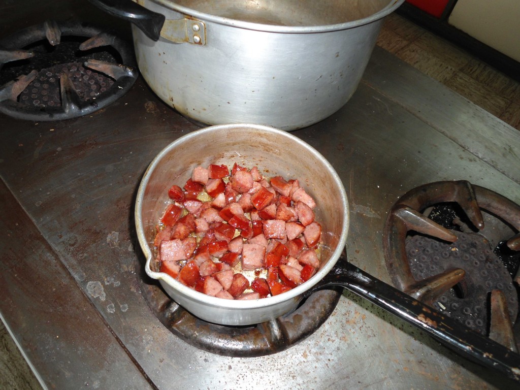 Die Heißwürstchen werden erwärmt und in kleine Scheiben geschnitten. Die Bratwürste werden ebenfalls in kleine Stücke geschnitten und gebraten.