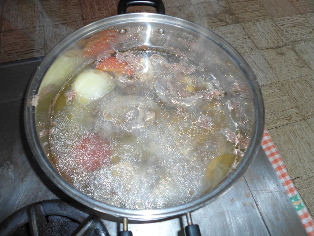 Heute wandten wir uns der „Cazuela“ zu, einem leckeren, würzigen Eintopf mit Fleisch (Rind oder Hähnchen), Mais, Kartoffeln und vielen anderen Gemüsesorten. Er ist in Chile sehr verbreitet und zählt ebenfalls, wie der Pastel de Choclo, zu einem der traditionellsten chilenischen Gerichte. Aber auch in Peru und Ecuador findet man ihn, wenngleich in anderen Variationen. Hier in Chile, oder besser gesagt im Süden Chiles, wird er jedoch entweder mit Rind- oder Hähnchenfleisch gegessen. Wir haben ihn mit Rindfleisch zubereitet.