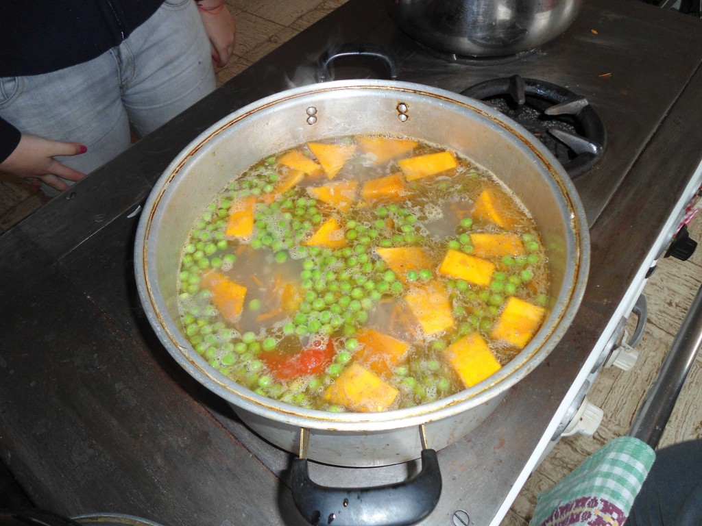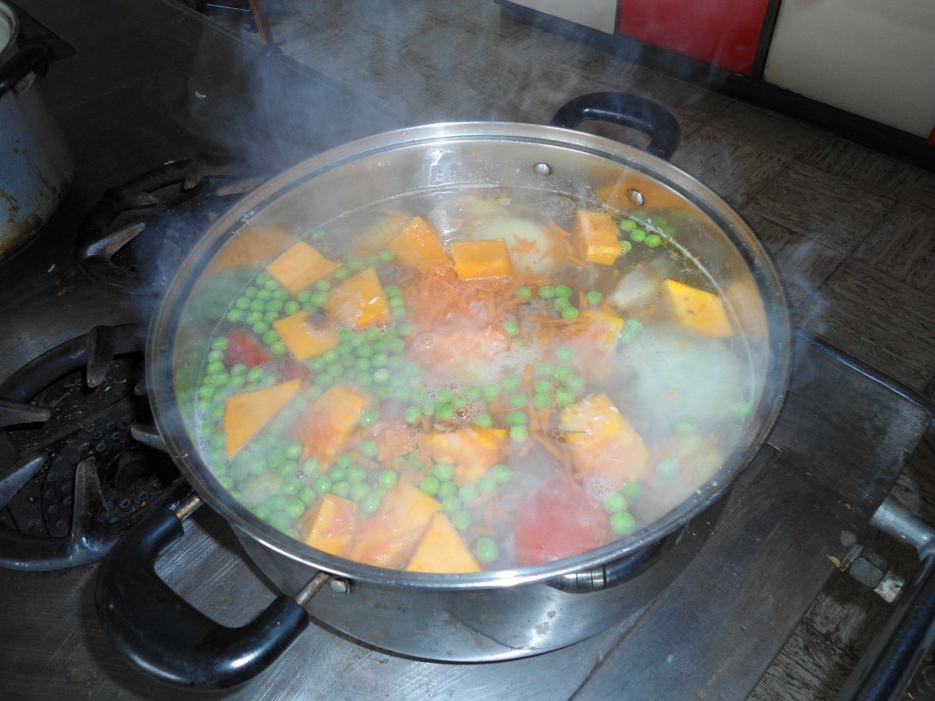 Dabei muss darauf geachtet werden, wann man welches Gemüse zufügt. Einige Sorten, wie zum Beispiel der Mais brauchen recht lange um zu garen. Die Kürbisstücke hingegen sind schnell gar. Die Kartoffeln sind in einem separaten Topf am Kochen. Es werden also erst die Stücke der Maiskolben in den Topf geworfen und später dann Möhren, Kürbis, Bohnen und/oder Erbsen.