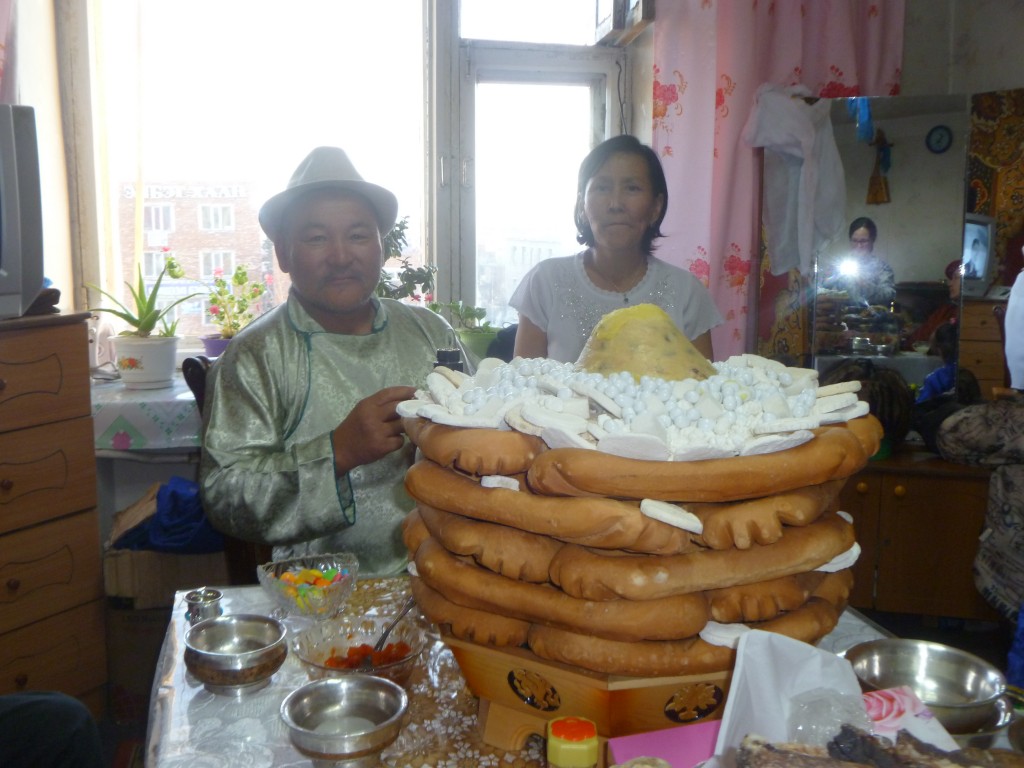 Es war 12 Uhr als wir uns in den Osten der Stadt aufmachten. Zur Oma meiner Gastmutter. Und zu meiner Mensa-Chefin (der Tante meiner Gastmutter) aus der Schule. Hier kannte ich das einzige Mal an den Feiertagen jemanden 😉 Und es war das einzige Mal, das ich Geld hergab. Allerdings unter ein wenig Protest der Beschenkten und meiner Gastmutter. Auch hier nur ein kurzer Stopp. Buuz. Wodka. Milchtee. Ich konnte es schon jetzt nicht mehr sehen 😀 Dieses Mal aber auch noch Airag. Also vergorene Stutenmilch. Ich freute mich, denn Airag ist zur Abwechslung mal kühl. Allerdings enthält es auch Alkohol. ca. 2% Vol. Bis jetzt hatte ich außer dem Milchtee noch keine alkoholfreien Getränke zu mir genommen. Geschenke. Ich bekam sogar einen kleinen Kaschmir-Schal. Und dann los. Ohne den Airag völlig leeren zu können.