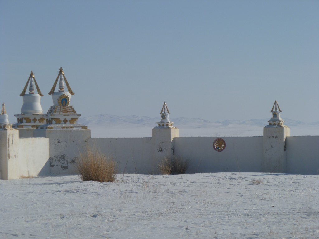 Dann wieder nach Hause. Und doch nochmal kurz los um Leute zu besuchen. Die besten Freunde des Vaters. – Die waren aber nicht da. So machten wir uns auf den Weg zum Kloster Shadavdarjaaliin. Es liegt am Rande der Stadt. Man hat einen wunderbaren Blick auf die Berge am Horizont. Und die Anlage ist ziemlich schön. Hier stand bereits seit 1660 ein Kloster. 1938 wurde es bei der allgemeinen Säuberung jedoch ausgelöscht. Erst 1990 wurde es am alten Ort wieder aufgebaut. – Dann aber los. Zu den Freunden. Dort war bereits bekannt, dass ich mitkommen würde. Ich bekam dieses Mal einen goldenen Becher. Was heißt das denn? – Es ist eine besondere Ehre. Ich bin ein besonderer Gast. Heißt aber auch, dass man austrinken muss. Zu den 5 Buuz musste ich 5 Becher Wodka trinken. Aus dem Goldenen. Der Wodka ist ja auch gut zur Verdauung. Na, dann! So viele Buuz habe ich übrigens bei keiner anderen Familie verdrückt. Am Ende wurde noch eine Schüssel mit Fleisch herum gereicht. Es sah etwas seltsam aus. So etwas hatte ich noch nicht gesehen. Ziemlich fettes Fleisch. Die Haut auch komisch. – Es war Murmeltier. Ich probierte. Es war Fett. Mehr Fett als Fleisch. Schmeckte nach gegrillt. Anders als anderes Fleisch. Näher beschreiben kann ich es gerade leider nicht. 😉