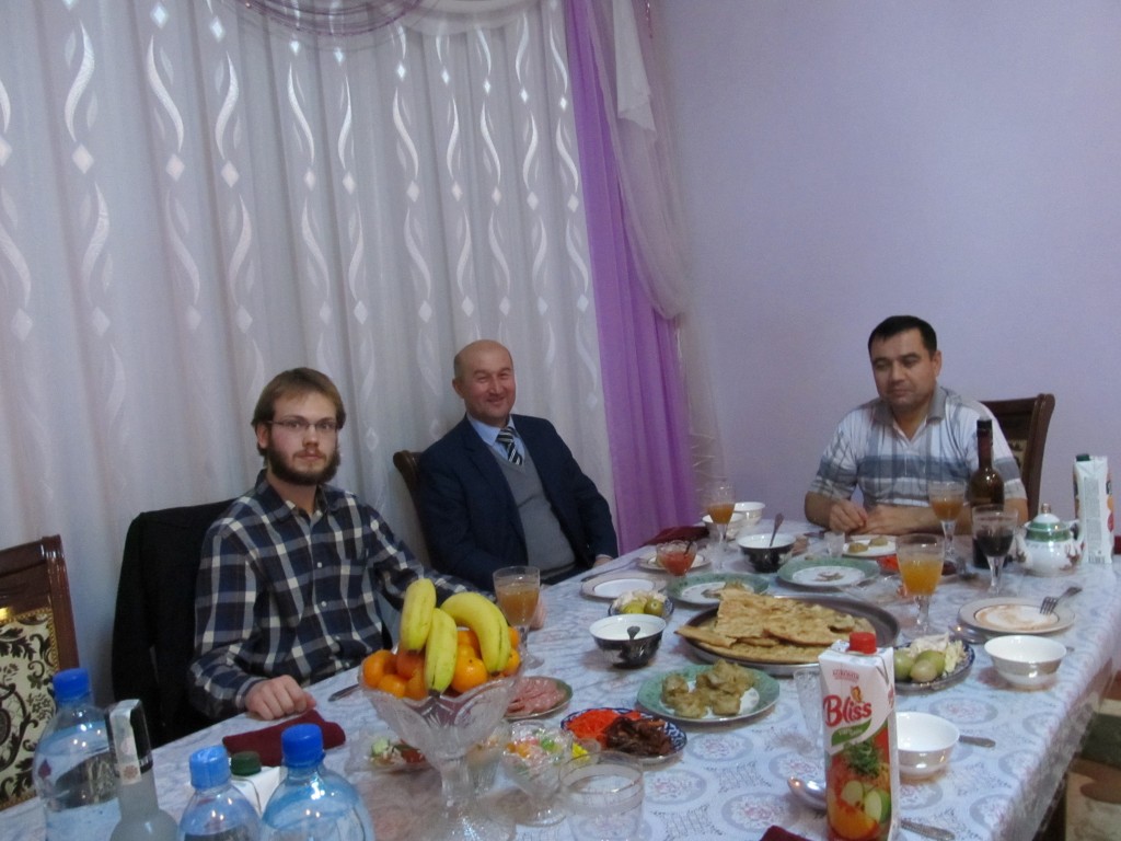 Ein typisch usbekisch gedeckter Tisch bei der fotografierenden Lehrerin, ihrem Mann (rechts), dem stellvertretenden Schulleiter (Mitte) und mir (links). Nur die offene Flasche Wodka fehlt – entweder sind wir also im Beginn der Vorspeisen oder eine ist schon leer…