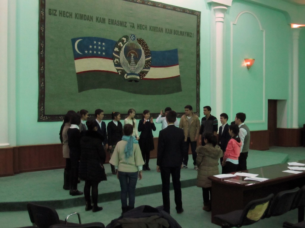 Aula und Bühne; Spielchen im Kreis sind gute Warmmacher.