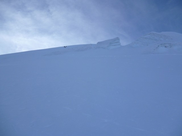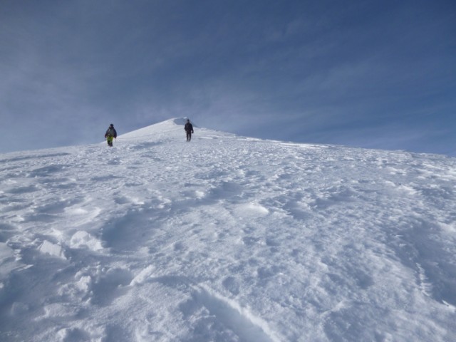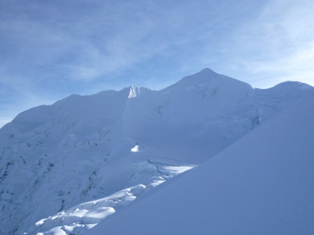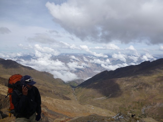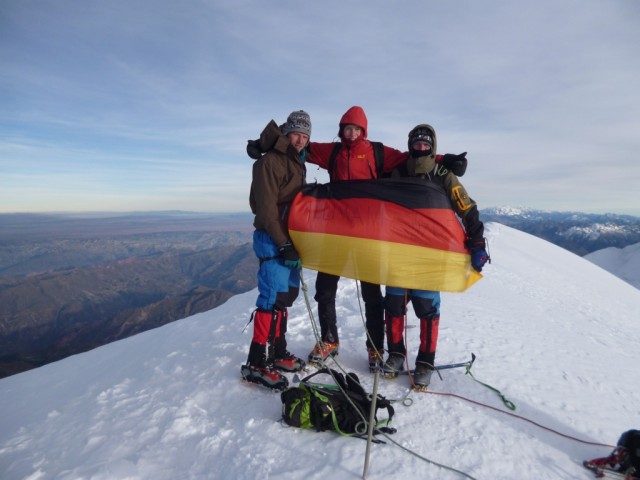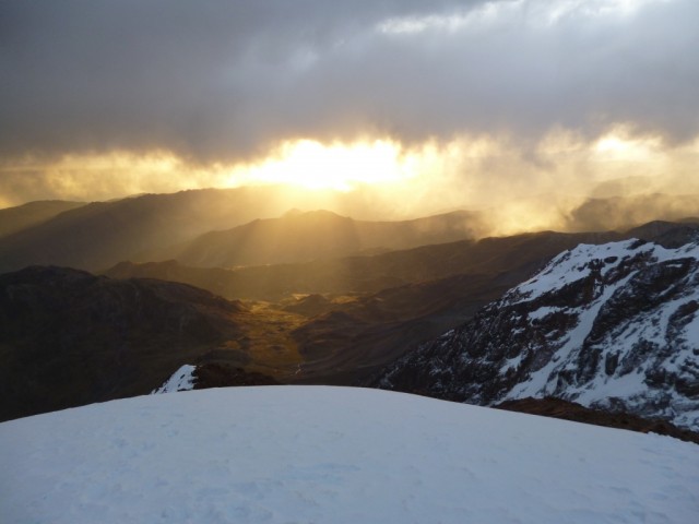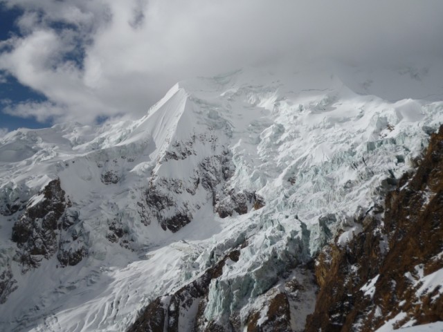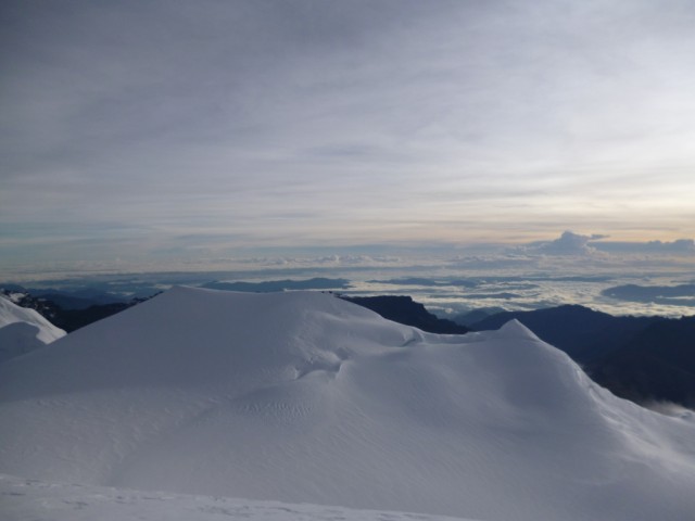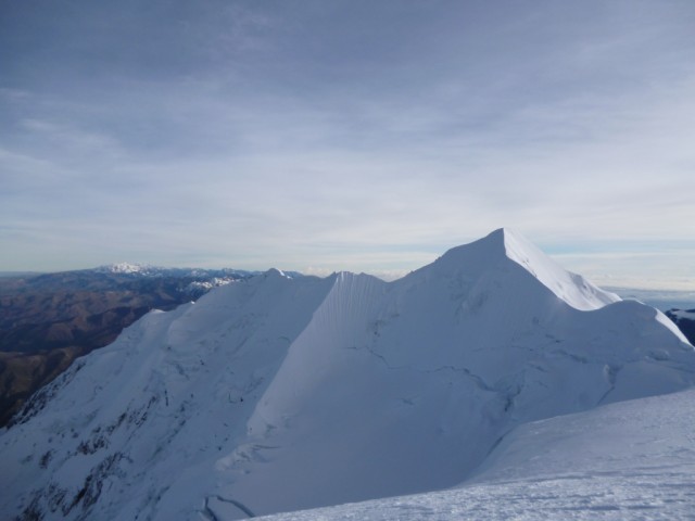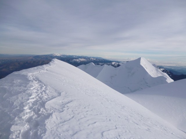Der Aufstieg selbst war zwar sehr anstrengend (mit Wänden bis zu 70° Steigung), jedoch nicht ganz so technisch wie erwartet. Circa eine dreiviertel Stunde bevor wir den Gipfel erreichten, ging die Sonne auf und als wir endlich oben ankamen, bot sich uns die traumhafte Aussicht eines wolkenfreien Tages – mit Sicht nach La Paz, die Yungas, den Sajama (höchster Berg Boliviens an der Grenze zu Chile) und die anderen Gipfel des Illimani. Wir blieben nur eine geschätzte Viertelstunde auf dem (Süd-)Gipfel, um dann in weniger als zwei Stunden rutschend und die tolle Aussicht geniessend zum Höhenlager abzusteigen. Nach weiteren drei Stunden durch Schnee und Geröllfelder bis zum Basislager, ruhten wir uns kurz aus, hatten das Glück, einen Kondor zu Gesicht zu bekommen, und stiegen dann nach Pinaya ab.