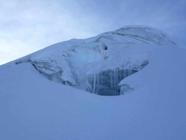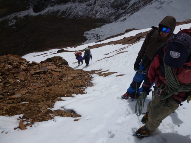 Am Tag darauf folgte eine sechsstündige Tour hinauf in das Eis zum Kondornest (Nido de Cóndores), einem Plateau auf dem Gletscher, von dem man eine unglaubliche Sicht über die Umgebung hatte. Auf dem Weg boten sich uns immer wieder tolle Aussichten auf das Bergmassiv mit seinen vierzehn Gipfeln und die Umgebung. Dieser Tag war noch um einiges fordernder als der vorherige, zumal wir auch ziemlich genau weitere eintausend Höhenmeter zurücklegten. Oben angekommen, wir hatten die Esel gegen Träger eingetauscht, und aufgebaut, kochten wir zuerst einmal Schnee, um Wasser für den nächsten (Gipfel-)Tag zu haben und assen ein Spirelli-Tütensuppenmix.Der Appetit auf 5400 Metern war auch wirklich nicht der grösste.