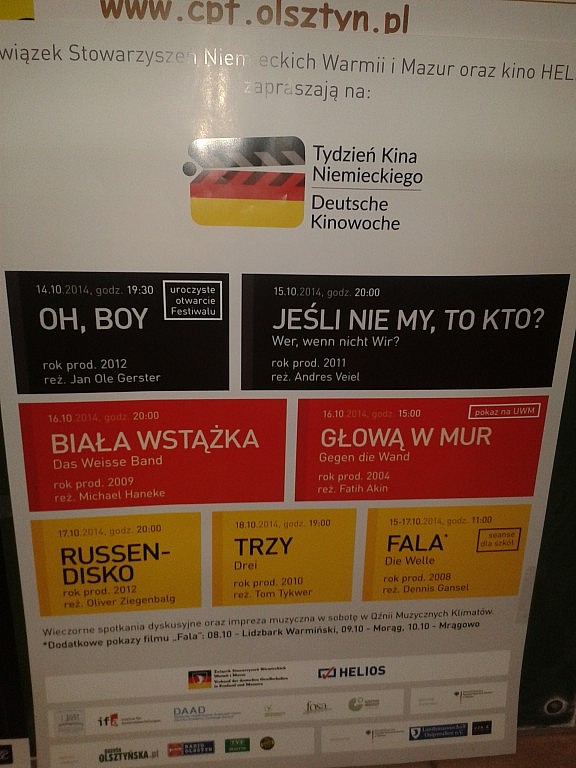 Mein tägliches Abendprogramm der letzten Woche hieß: Kino, Kino und nochmals Kino! Nicht, weil es eine besondere Rabattaktion gab oder weil das Popcorn so gut schmeckt, sondern weil der Verband der deutschen Minderheit in Ermland und Masuren die deutsche Kinowoche (Tydzien Kina Niemieckiego) hier in Olsztyn organisierte.