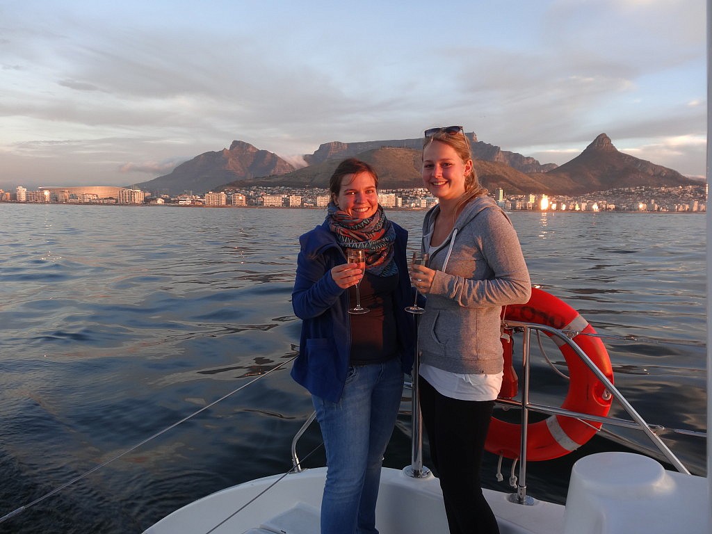 Reisegruppe mit Sekt und Tafelberg