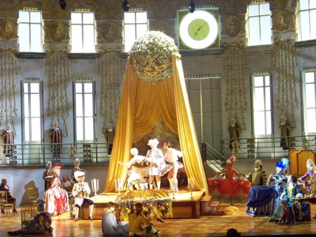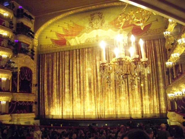 Aber ich habe ja noch nichts zum Stück gesagt. Wir waren zur Generalprobe, aber eigentlich war es wie die Uraufführung, denn das gesamte Theater war voll (bis auf die Präsidentenloge, s.o.) und die Oper wurde komplett durchgespielt. Auch ist es die aller erste Oper von Strauss, die jemals in Russland aufgeführt wird. Das war schon ein bisschen sehr beeindruckend. Insgesamt dreieinhalb Stunden hat das ganze gedauert und ich habe materiell gesehen, noch nie eine Oper in der Art erlebt. Die Bühnenbilder waren der Wahnsinn, ebenso die Kostüme. Aber wenn ein Theater innen drinnen fast ganz vergoldet ist, dann muss natürlich auch ein entsprechendes Ambiente am Ort des Geschehens her. Im dritten Akt gab es sogar eine Geisterbahn auf der Bühne und ich wäre schon gerne eine Runde mitgefahren…aber selbst das erste Szenenbild reicht um sich das Ausmaß vorzustellen.