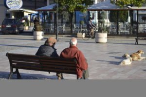 In Shkodra hält der Bus an einem großen, überfüllten Kreisverkehr. Ich verabschiede mich mit „Mirupafshim“ von dem alten Mann neben mir. Er nickt lächend als Antwort und hat wohl jeglichen Versuch eine Kommunikation zu starten schon längst aufgegeben. Mein Anschlussbus fährt erst in einer Stunde und ich nutze die Zeit und laufe die Fußgängerpassage in den warmen Sonnenstrahlen entlang. Die Läden, Cafes und Restaurants sind zu dieser Jahreszeit noch geschlossen. Mehrere Bettler halten sich davor auf. Ein Mann sitzt vor einem der einzigen geöffneten Cafes mit einer Bierflasche auf dem Tisch. Er ruft mir etwas auf albanisch zu und deutet auf sein Bier. Ich falle wohl mit meiner bunten Ski-Jacke und den vollen Taschen auf. Den Mann ignorierend laufe ich weiter, setzte mich auf eine Bank in der Sonne und esse eine Kleinigkeit. Frauen und ältere Leute auf Fahrrädern fahren an mir vorbei. Straßenhunde schlafen in den letzten Sonnenstrahlen.