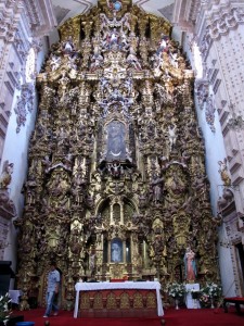 Dann bin ich wieder runtergefahren und hab mir auf dem Rückweg mehrer Kirchen angesehen….die Mexicaner stehen ja total auf Kirchen und sind auch super religiös….bei allem bekreuzigen die sich hier, auch beim Busfahren! Wobei ich festgestellt habe, dass das ja bei dem Fahrstil mancher Busfahrer auch echt angebracht ist 😀 Neee aber im Ernst, es lässt sich doch ganz gut damit fahren, man muss sich halt erst daran gewöhnen! Zurück zu den Kirchen….davon hab ich mir mehrer angesehn und was mir aufgefallen ist, ist das viele keine bunten Fenster haben (so wie man das in europa kenne) und es schon echt ein spektakel ist, wenn sie überhaupt fenster haben! Dafür sind die Kirchen von innen mit ganz viel Glod ausgestattet….aber auch nicht spärlich verteilt, sondern immer ganz massiv gehäuft eine ganze Wandseite (meistens mehr als eine Wandseite!) mit einer Goldfassade geschmückt….naja jeder hat halt so seinen eigenen Geschmack 😉