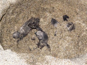 Also gings los, und wir hatten voll Glück, wir sind nur 10 Minuten gelaufen und haben schon eine Schildkröten Mama gesichtet, wie sie grad ihr loch für die Eier in den Sand grub….da konnten wir dann zuschauen wie sie ihre Eier ablegt und anschließend das Loch wieder vergräbt! natürlich haben wir die Eier vor dem vergragen rausgeholt, sonst wärs ja viel zu viel arbeit 😉 Die Eier waren echt komisch….die waren kugelrund, so groß wie ein Golfball und hatten so eine komische Schale, die sich angefühlt hat wie das Material eines Ping Pong Balls….ganz weich, und wenn ne Delle reinkam, hat die sich automatisch nach ein Paar minuten wieder zurück gebildet…..voll cool!!!! 😀