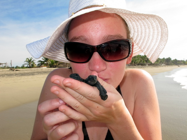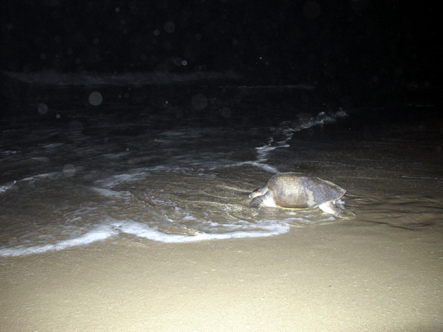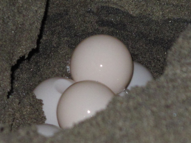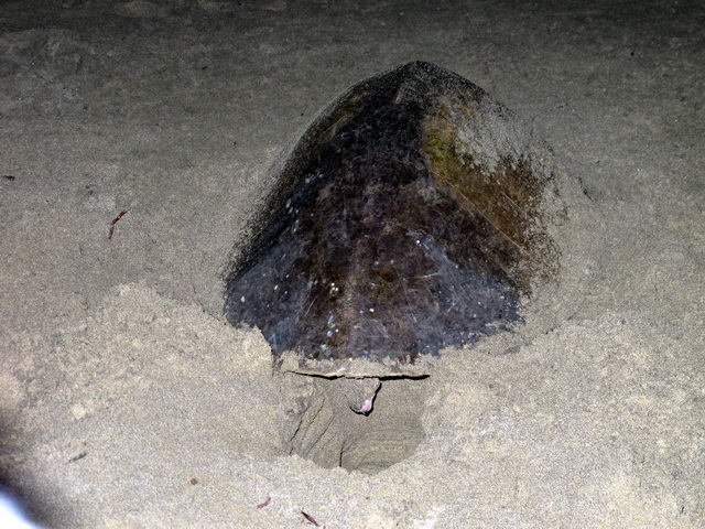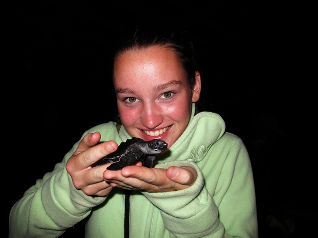 Also gings los, und wir hatten voll Glück, wir sind nur 10 Minuten gelaufen und haben schon eine Schildkröten Mama gesichtet, wie sie grad ihr loch für die Eier in den Sand grub….da konnten wir dann zuschauen wie sie ihre Eier ablegt und anschließend das Loch wieder vergräbt! natürlich haben wir die Eier vor dem vergragen rausgeholt, sonst wärs ja viel zu viel arbeit 😉 Die Eier waren echt komisch….die waren kugelrund, so groß wie ein Golfball und hatten so eine komische Schale, die sich angefühlt hat wie das Material eines Ping Pong Balls….ganz weich, und wenn ne Delle reinkam, hat die sich automatisch nach ein Paar minuten wieder zurück gebildet…..voll cool!!!! 😀
