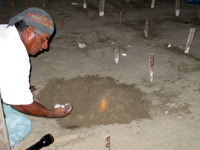 Um 9 uhr abends ging es dann los die Welt und die Schildkröten zu retten! Die Schildkröten (Tortugas negro….oder so ähnlich) legen nämlich jetzt im November ihre Eier, die babies schlüpfen aber erst Monate später….und weil es verückte mexis (und bestimmt auch touris!) gibt, die gerne Schildkröten Eier essen, müssen wir jetzt Eierlegende Schildkröten mamas aufspüren, die Eier einsammeln (bevor es die Eierfressenden Menschen tun!) und ins Camp in Sicherheit bringen, wo die kleinen Babies dann ganz in ruhe nach ein paar Monaten schlüpfen können! Voll fett nachhaltig, gell?!?! 😀 😀