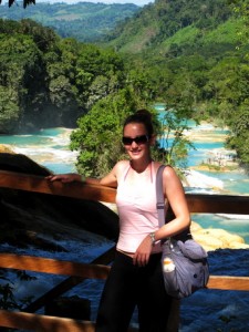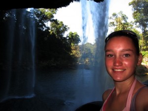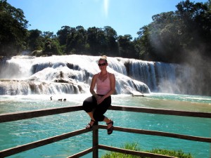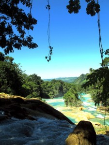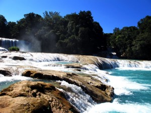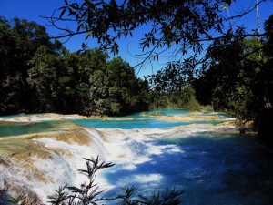 Am nächsten tag ging es dann auf eine organisierte Tour zu den Wasserfällen Misol Ha und Agua Azul. Sehr zu meinem Entsetzen musste ich feststellen, das genau die gleiche Straße gefahren wird, wie ich hergekommen bin (aus San Christobal) und demzufolge war die fahrt genauso kurvig….aber diesmal wurd mir zum Glück nicht sooooo schlecht! (aber ich hab ja jetzt auch schon übung 😉 ) Nach ca. 1 Stunde sind wir in Misol Ha angekommen, hatten aber leider nur 30 Minuten Zeit uns da umzuschauen…..das war ein bisschen blöd, weil ich mich dadurch echt beeilen musste…..Misol ha war schon ein sehr hoher Wasserfall und man konnte hinter dem Wasserfall langgehen, und dann noch für 10 Peos extra in eine Hohle reinklettern, wo man eine kleine Quelle aus dem innern des berges sprudeln sehn konnte….und Fledermäuse gabs da auch noch! Aber viel hat man nicht gesehn, weil es war stock duster, und ich musste höllisch aufpassen nicht hinzufliegen 😉