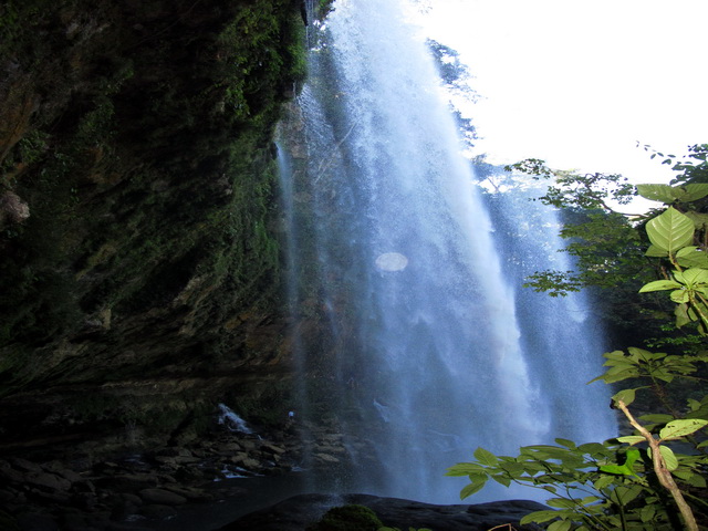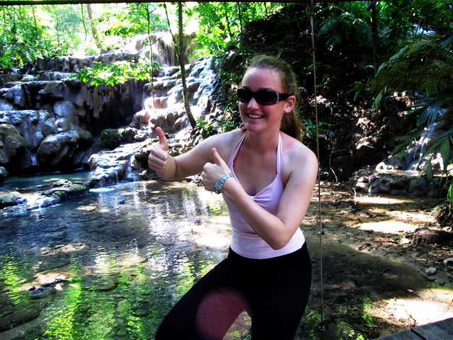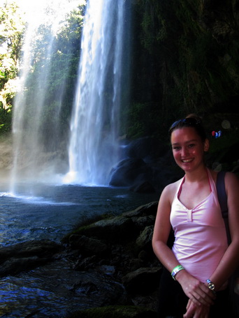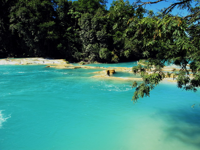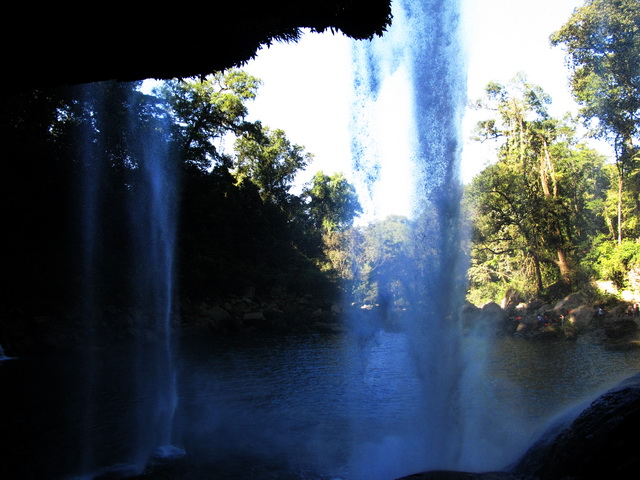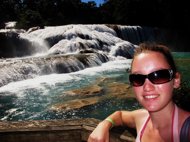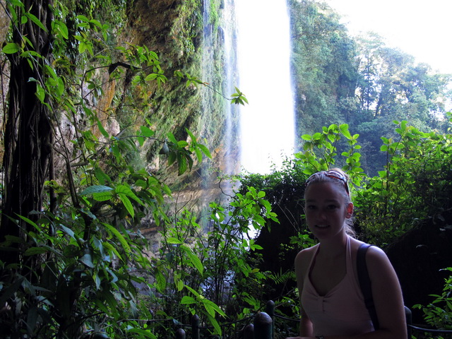 Am nächsten tag ging es dann auf eine organisierte Tour zu den Wasserfällen Misol Ha und Agua Azul. Sehr zu meinem Entsetzen musste ich feststellen, das genau die gleiche Straße gefahren wird, wie ich hergekommen bin (aus San Christobal) und demzufolge war die fahrt genauso kurvig….aber diesmal wurd mir zum Glück nicht sooooo schlecht! (aber ich hab ja jetzt auch schon übung 😉 ) Nach ca. 1 Stunde sind wir in Misol Ha angekommen, hatten aber leider nur 30 Minuten Zeit uns da umzuschauen…..das war ein bisschen blöd, weil ich mich dadurch echt beeilen musste…..Misol ha war schon ein sehr hoher Wasserfall und man konnte hinter dem Wasserfall langgehen, und dann noch für 10 Peos extra in eine Hohle reinklettern, wo man eine kleine Quelle aus dem innern des berges sprudeln sehn konnte….und Fledermäuse gabs da auch noch! Aber viel hat man nicht gesehn, weil es war stock duster, und ich musste höllisch aufpassen nicht hinzufliegen 😉
