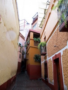 Auf dem Weg zum Aussichtspunkt der Stadt bin ich zuerst an dem „Callejón del Beso“ vorbeigekommen, wo zwei Häuser so eng beieinander stehen das sich die Balkone berühren und die bewohner sich so (verbotenerweise!) küssen könnten….so ne ähnliche story wie die bei Rome und Julia 😉 Dannach gings weiter nach oben, mit dem Teleferico…..was ne ziemliche Entäuschung war, weshalb ich bergab wieder zu Fuß gelaufen bin! Und oben angekommen, war nicht viel mit Aussicht, weil durch den ganzen Regen lag alles im Nebel und war grau in grau…..aber naja lässt sich nicht ändern und so ein bissle Nebel ist machmal auch ganz appart 😉