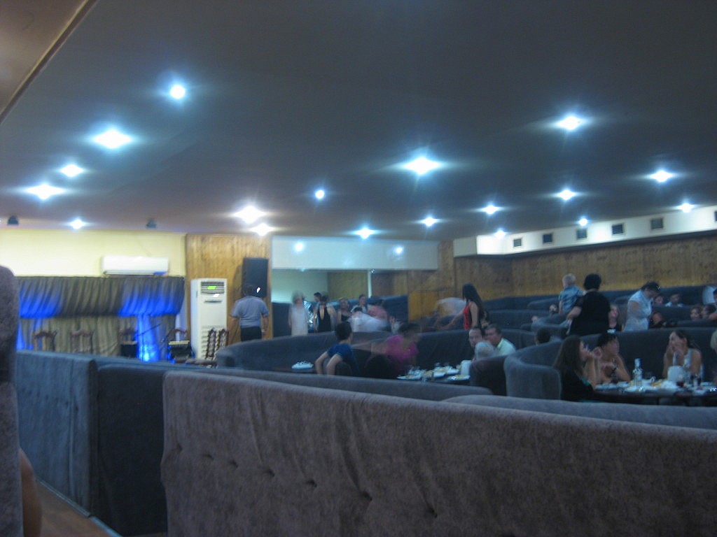 Man lässt sich einen Tisch zuweisen, setzt sich und weist ihr den Platz mit Blick auf Tanzfläche und „Bühne“ zu. Die laute Musik nimmt einem das Problem, kein Gesprächsthema zu haben. Wie in Georgien üblich werden verschiedene kleinere Gerichte bestellt, die man sich dann teilt. Kurze Zeit später bringt einer der livrierten Kellner eine Karaffe Wein, aus der auch sogleich ausgeschenkt wird. Leere Gläser? So etwas kennt man in Georgien nicht. Alsbald bringt der Tamada (~Tischleiter, in diesem Fall der Prüfungsvorsitzende) den ersten Trinkspruch aus. „Auf …“, daraufhin trinkt jeder sein Glas (ganz!) aus. Die junge Freiwillige spürt die kühle, herb-saure, erstaunlich gelbe Flüssigkeit ihren Hals hinunterlaufen. Ob das jetzt wohl den ganzen Abend so weitergeht?